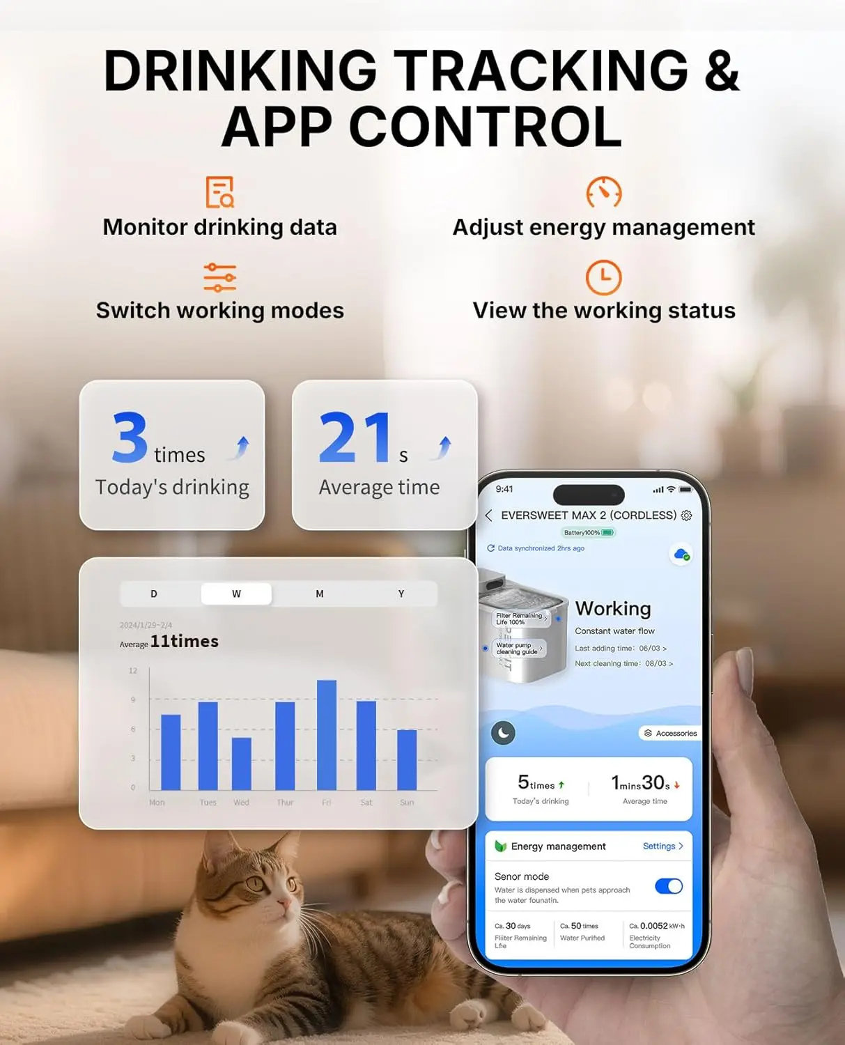 This automatic pet water fountain is designed to keep your cats and dogs hydrated with convenience and style. Key features include: 1. Cordless Operation: Enjoy hassle-free setup without tangled wires, making it easy to place anywhere in your home. 2. Motion Sensor Technology: The fountain activates automatically when your pet approaches, ensuring fresh water is always available on demand. 3. Large 3-Liter Capacity: With a 101-ounce reservoir, this fountain provides ample water for multiple pets or extended use without frequent refills. 4. Smart App Control: Monitor and adjust settings remotely via a user-friendly app, allowing you to customize flow modes and track water levels from your smartphone. 5. Stainless Steel Tray: The durable tray is easy to clean and resistant to stains, promoting hygiene and longevity for your pet's drinking area. 6. Dishwasher-Safe Design: All removable parts are dishwasher-safe for effortless cleaning, saving you time while maintaining cleanliness. 7. Quiet Pump System: Operates silently to avoid disturbing your pets or household, ideal for indoor use in any room. 8. Energy-Efficient Performance: Low power consumption helps reduce electricity costs while providing reliable hydration support. 9. Versatile Compatibility: Suitable for both cats and dogs of various sizes, offering a practical solution for multi-pet households. 10. Safety Features: Built with non-toxic materials and automatic shut-off functions to ensure your pet's safety during use. This product combines modern technology with pet-friendly design to enhance your furry friend's drinking experience.